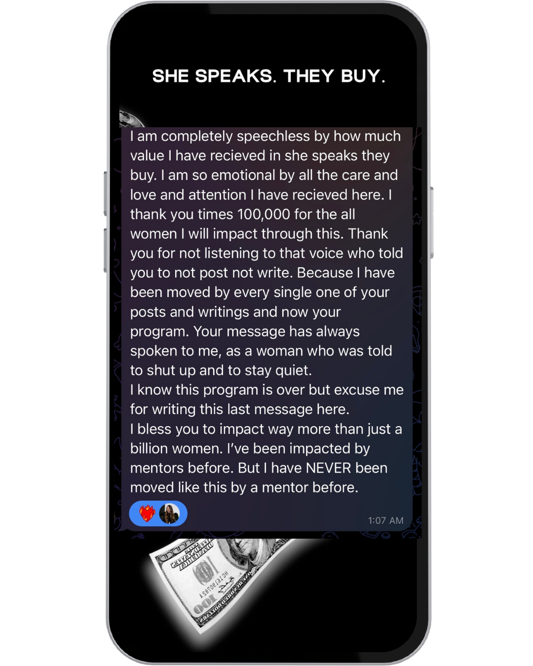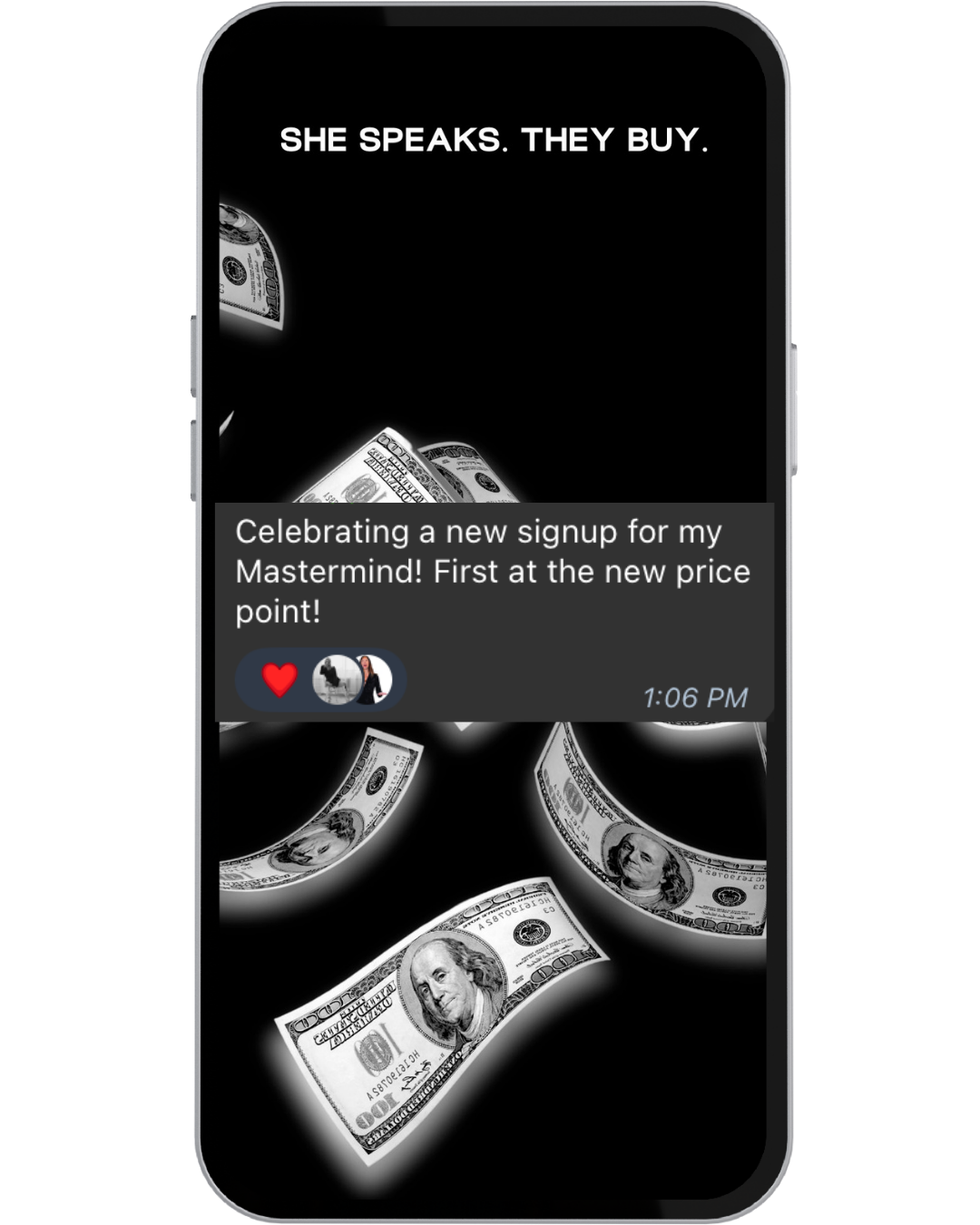 Instant access to the private She Speaks. They Buy. Telegram channel (founding round only)