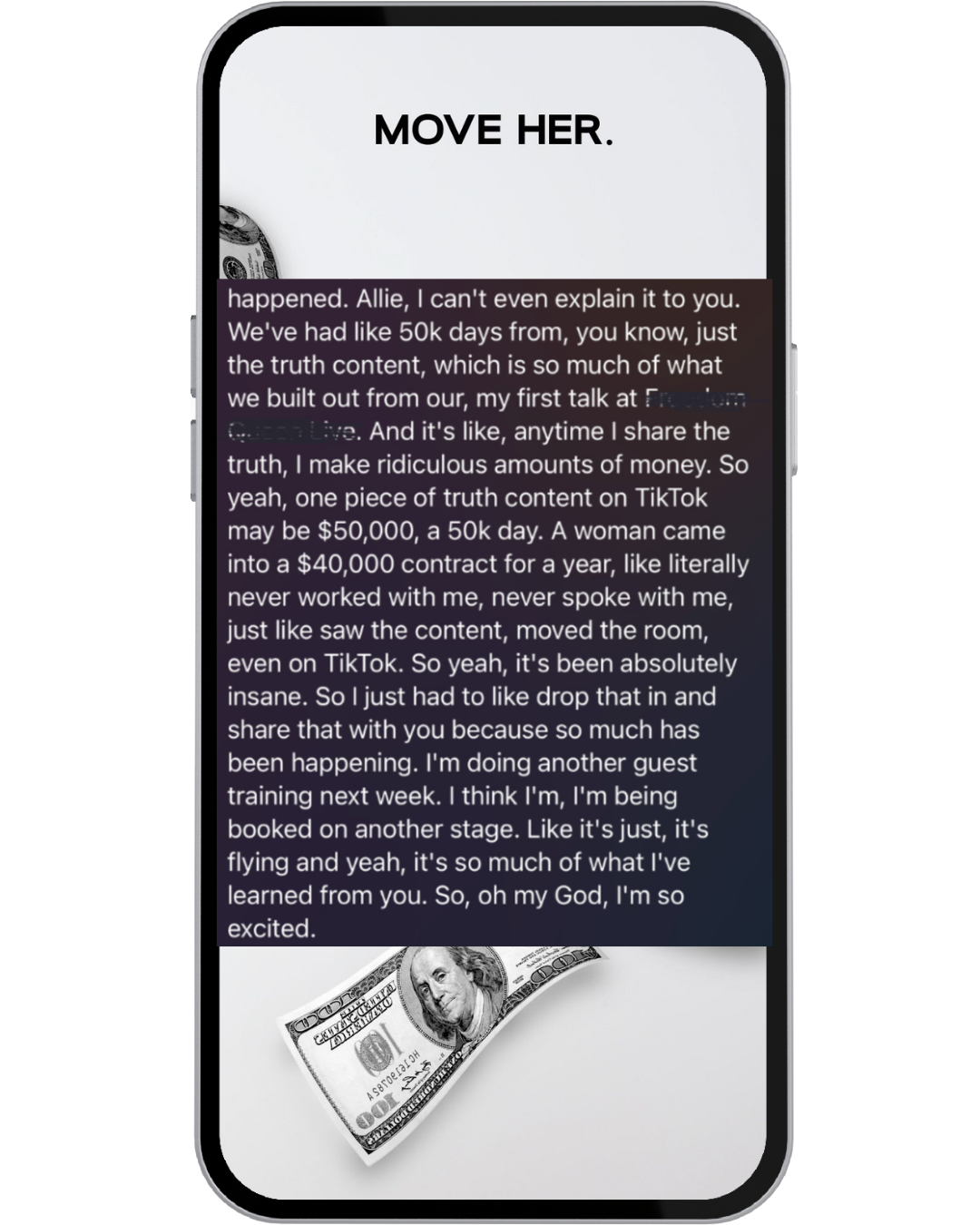 Inside MOVE HER, you’ll get immediate access to the Decision Accelerator System™ — a premium buyer messaging system rooted in energetics, psychology, and what to actually say to move high-end buyers.